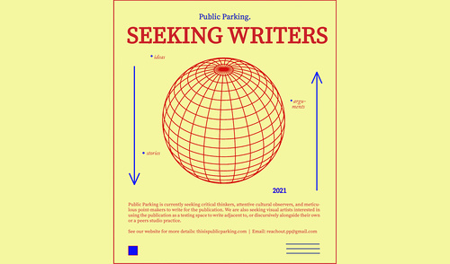 Public Parking is an online community journal interested in showcasing working practices of emerging creators/thinkers while discounting the antiquated divisions between film, fine arts, design, crafts, music, and the like. We are here with the support of our contributors to open up an environment that allows for further discourse and outreach of work by creative thinkers.