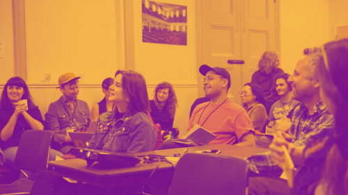 Image description: Common Field Network members attend the 2019 Convening in Philadelphia, PA. Participants sit in a classroom, oriented towards the front. They review literature and engage with the discussion, joyfully, smiling. In the middle, a young person in a red shirt and black baseball hat looks forward mirthfully. In front of him, a young person with long brown hair wears a denim jacket and does the same. They sit beside a table around which many other participants are gathered and upon which a conference-style telephone rests.. Behind them, a wall with a large wooden double door. Convening participants sit in chairs along the wall. Above them hangs a photograph of the Friends Center meeting space, a large wooden Quaker meeting room. The image has a gold and purple graphic wash overlaid on the photograph.