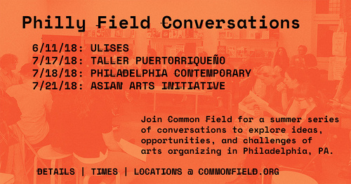 Initiated by Common Field to engage with the core concerns of the local arts landscape through discussion and discovery, the series has been developed through partnership with local arts leaders: Asian Arts Initiative, Philadelphia Contemporary, Taller Puertorriqueño, and Ulises. Through these gatherings, Common Field aims to articulate and activate a local network of arts organizers that will inform both the themes and programs for the Common Field 2019 Convening in Philadelphia, and the goals for local arts organizing ahead.