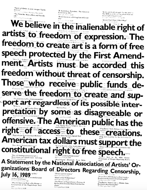 In 1990, Art Matters had given fellowships to artists’ space pioneer Joy Silverman and Art Matters/Visual AIDS acolyte Alexander Gray to conceive the National Campaign for Freedom of Expression (NCFE) to alleviate the burden of advocacy and activism absorbing NAAO’s identity as an arts service organization. David Mendoza was appointed the first executive director of the Campaign; his tenure ran from 1991-1997. In 2000, NCFE ceased operations after transferring programs and assets to a number of organizations, including NAAO.